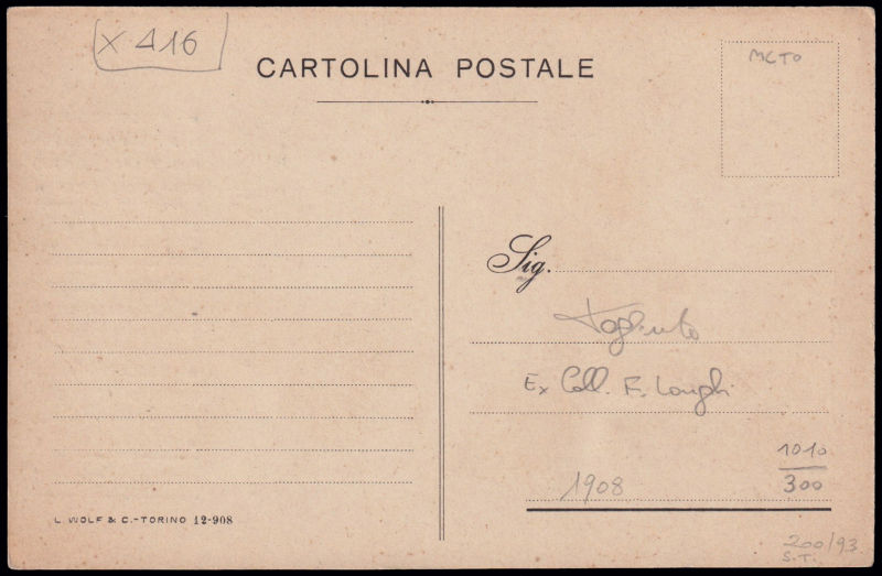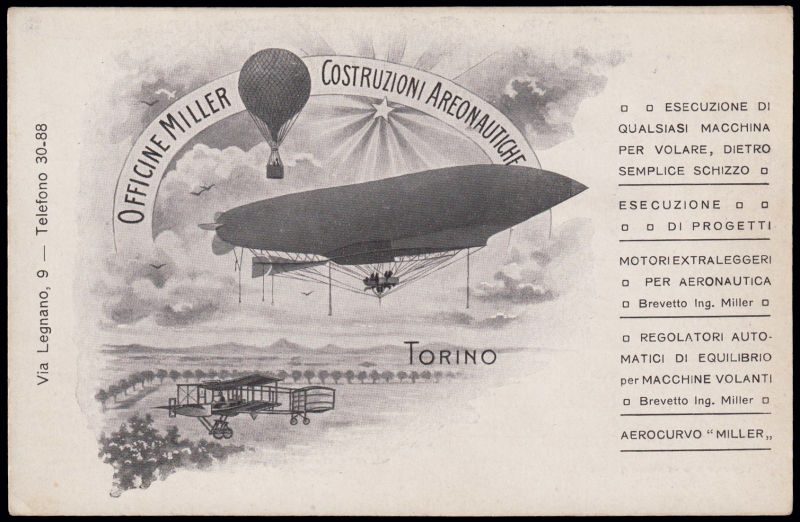 1908 TORINO - PRIMA FABBRICA DI COSTRUZIONI AERONAUTICHE. Cartolina "Officine Miller" (Wolf & C. Torino 12-908), nuova. Riprodotta a pag. 35 del Catalogo "Aerofilia Italiana". Longhi 142. Ex Coll. S. Taragni. Rara. (Image) (ImageA)