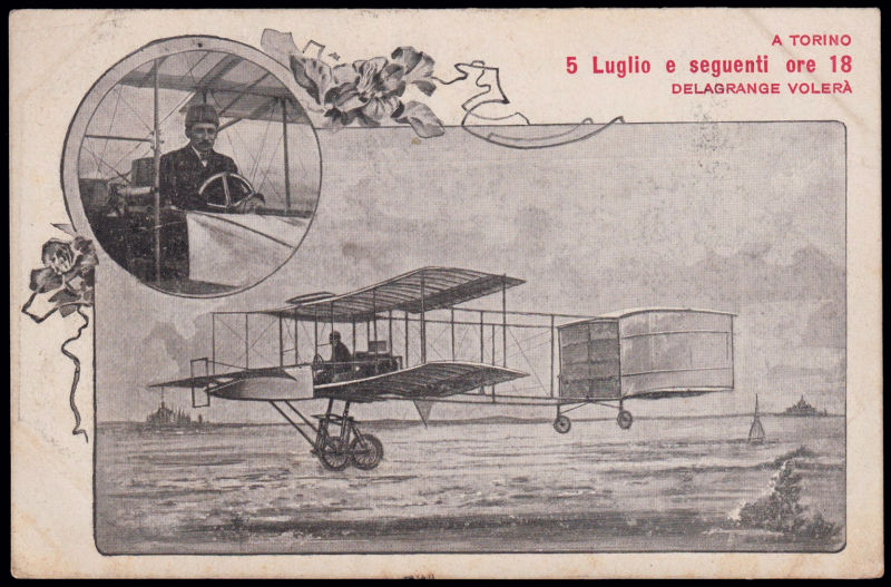 1908 TORINO - PRIMI ESPERIMENTI DI AVIAZIONE IN ITALIA. Cartolina monocroma con soprastampa in rosso "A TORINO/5 Luglio e seguenti ore 18/DELAGRANGE VOLERA'". Nuova. Longhi 127a (nuova numerazione). Riprodotta a pag. 47