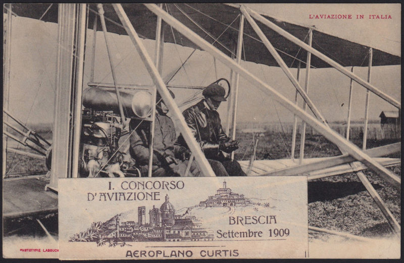1909 BRESCIA I° CIRCUITO AEREO INTERNAZIONALE. Cartolina spedita da Montichiari a Castiglione delle Stiviere il 10/9/1909 con etichetta "AEROPLANO CURTIS". Longhi 192. Riprodotta a pag. 38 del Catalogo "Aerofilia
