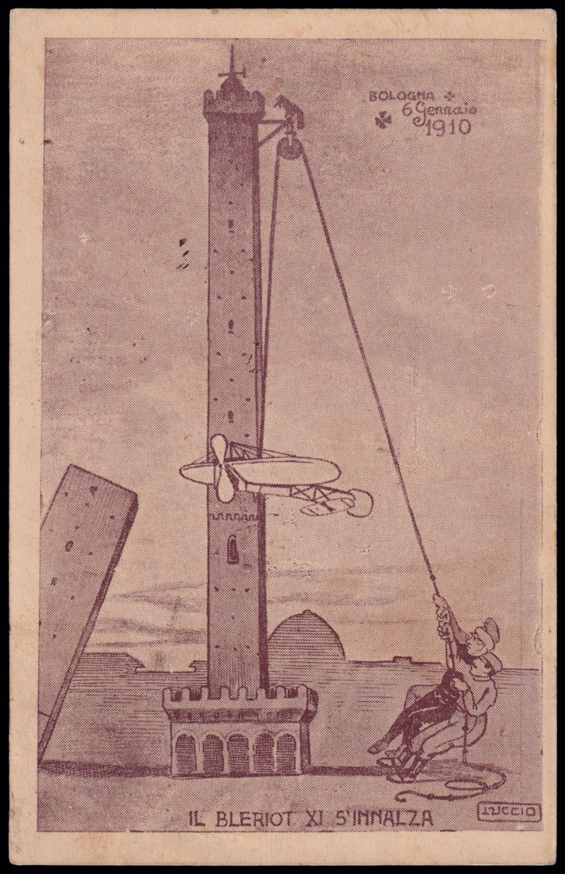 1910 BOLOGNA - PRIMO SPETTACOLO DI AVIAZIONE. Cartolina satirica verticale "Il Bleriot XI s'innalza", firmata Luccio, viaggiata da Bologna a Padova il 12/1/1910 (timbro di arrivo). Nel testo: Mando all'amico Renato il