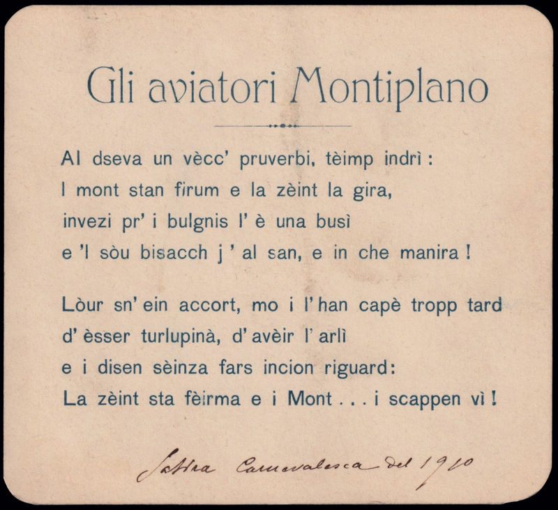 1910 BOLOGNA - PRIMO SPETTACOLO DI AVIAZIONE. Cartoncino orizzontale a stampa con zerudella satirica "Gli aviatori Montiplano". Longhi 215. Riprodotta a pag. 65 della nuova edizione del Catalogo "Aerofilia Italiana". (Image) (ImageA)