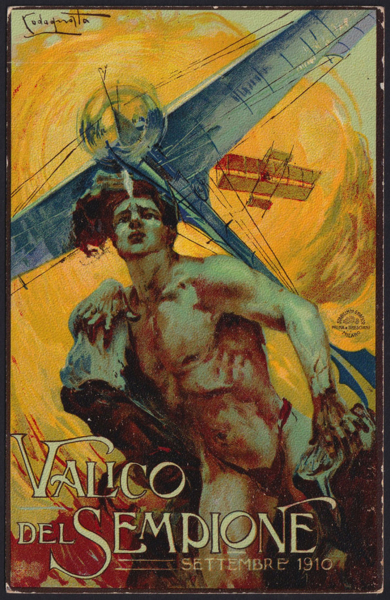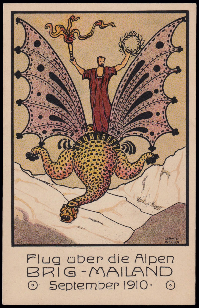 1910 BRIGA - DOMODOSSOLA PRIMA TRAVERSATA DELLE ALPI IN AEROPLANO. Cartolina verticale policroma svizzera. Nuova. Longhi 335. Riprodotta a pag. 106 del catalogo "Aerofilia Italiana". (Image) (ImageA)