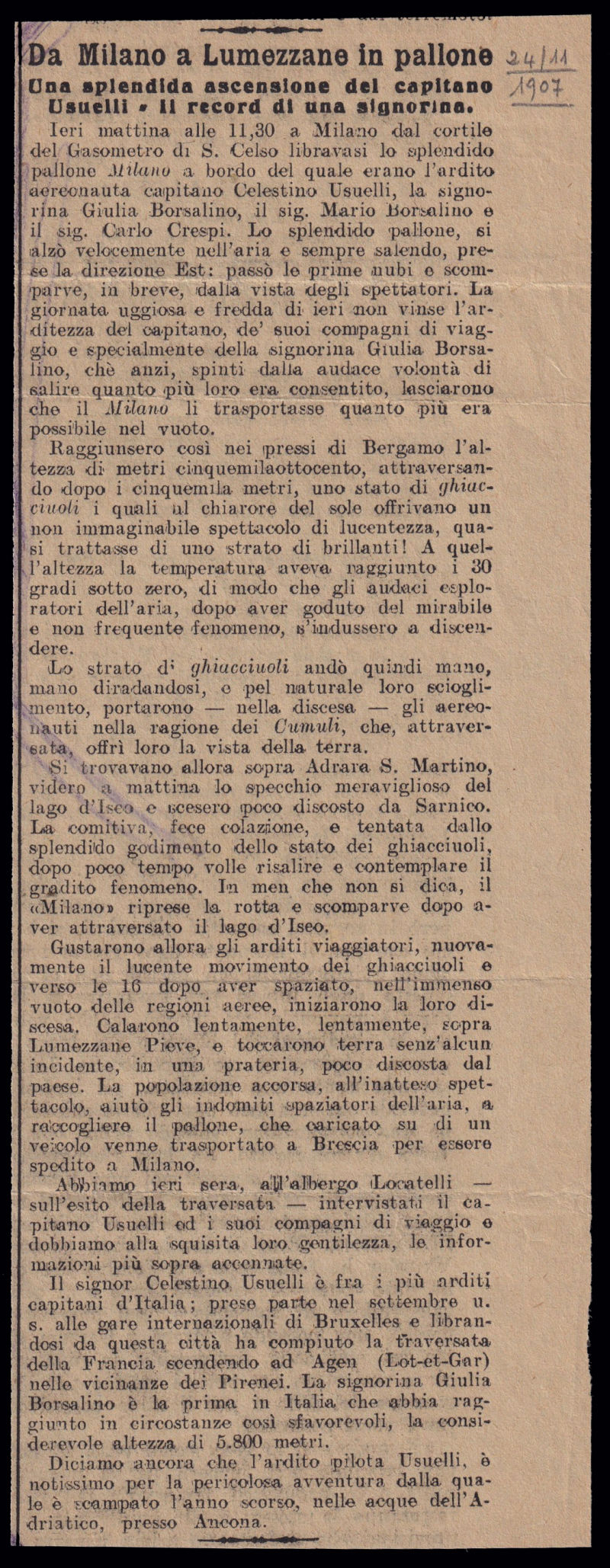 1907 MILANO - LUMEZZANE ASCENSIONE LIBERA DEL PALLONE "Milano". Diagramma tracciato del barografo durante il volo (unico noto volato). Unitamente articolo di giornale dell'epoca dal quale Longhi ha redatto la