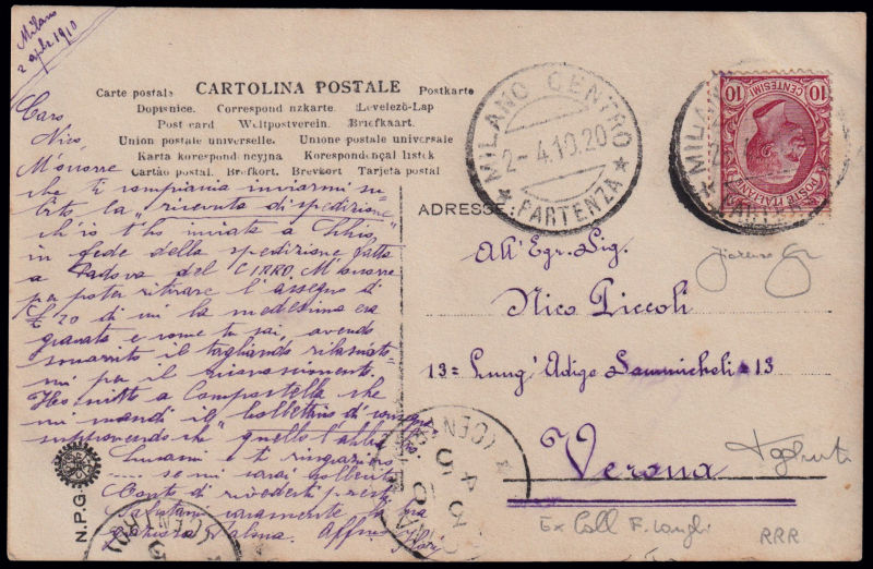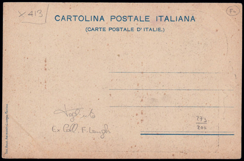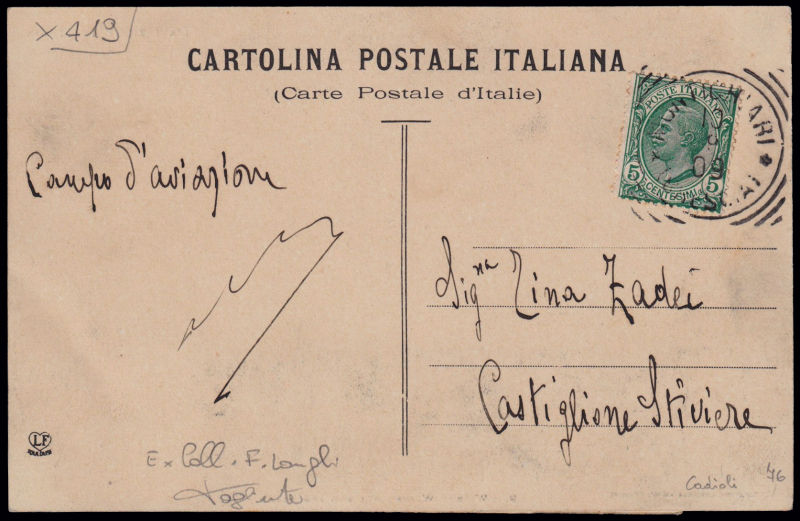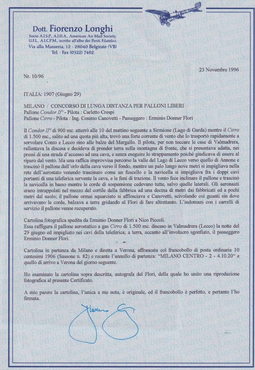 catalogazione sul libro "Aerofilia Italiana". Riprodotta a pag. 43 della nuova edizione del Catalogo "Aerofilia Italiana". Longhi 110. Massima rarità della collezione.