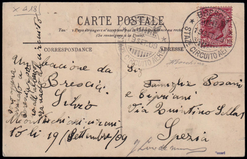 1909 BRESCIA I° CIRCUITO AEREO INTERNAZIONALE. Cartolina spedita da Brescia per Spezia il 19/9/1909 affrancata con francobollo Leoni da 10 centesimi annullato col guller speciale "Staz.ne Circuito Aereo * BRESCIA".