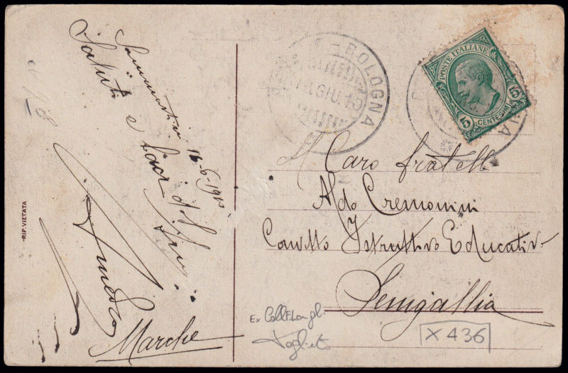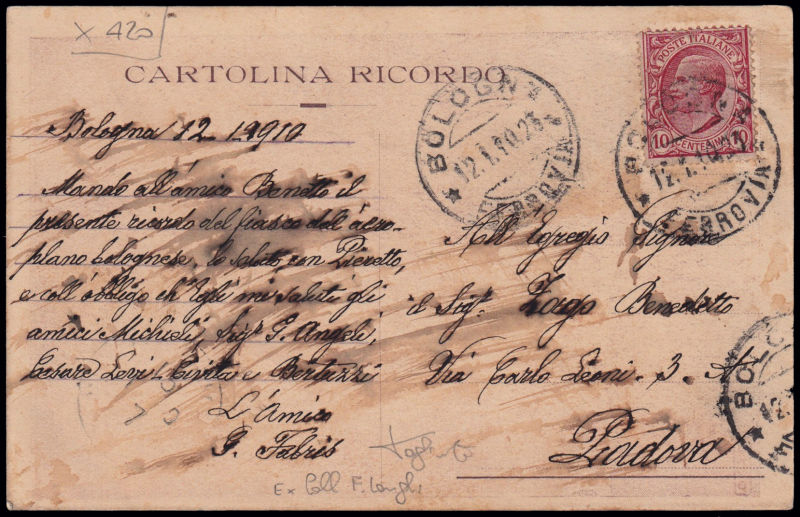presente ricordo del fiasco dell'aeroplano bolognese... L'amico G. Fabris. Longhi 213. Rara viaggiata. (Image) (ImageA)
