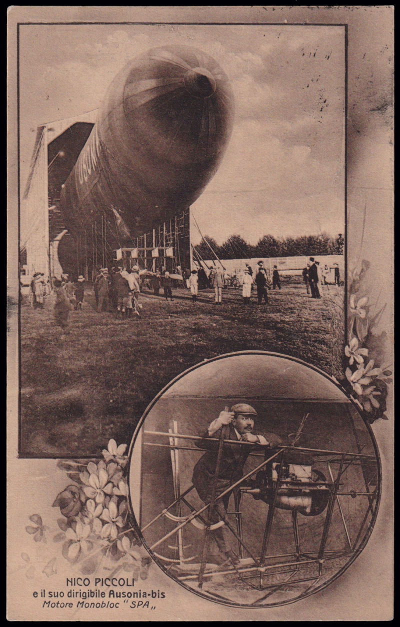 1911 RAID VERONA - BOSCOMANTICO DEL DIRIGIBILE AUSONIA BIS. artolina "Nico Piccoli e il suo dirigibile Ausonia - Bis. Motore monobloc SPA". Viaggiata. Longhi 415. Riprodotta a pag. 63 del catalogo "Aerofilia