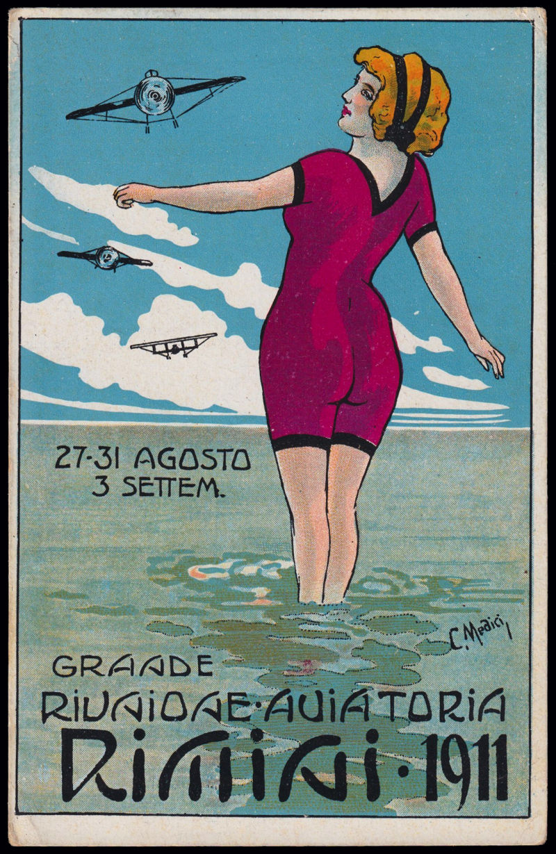 1911 RIMINI RIUNIONE AVIATORIA. Cartolina ufficiale policroma firmata Medici (Prina e Bresciani, Milano). Nuova. Longhi 520. Rara e ben conservata. (Image) (ImageA)
