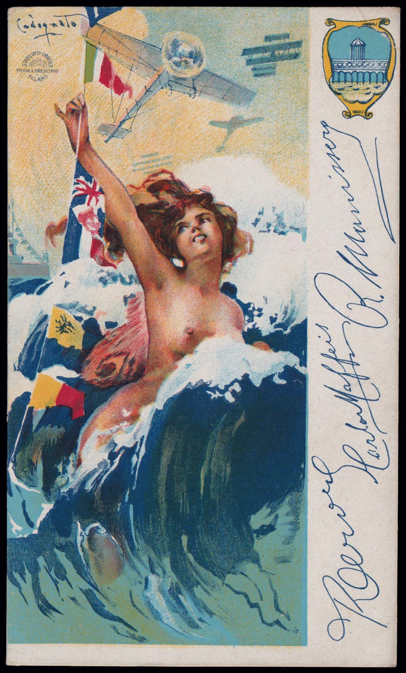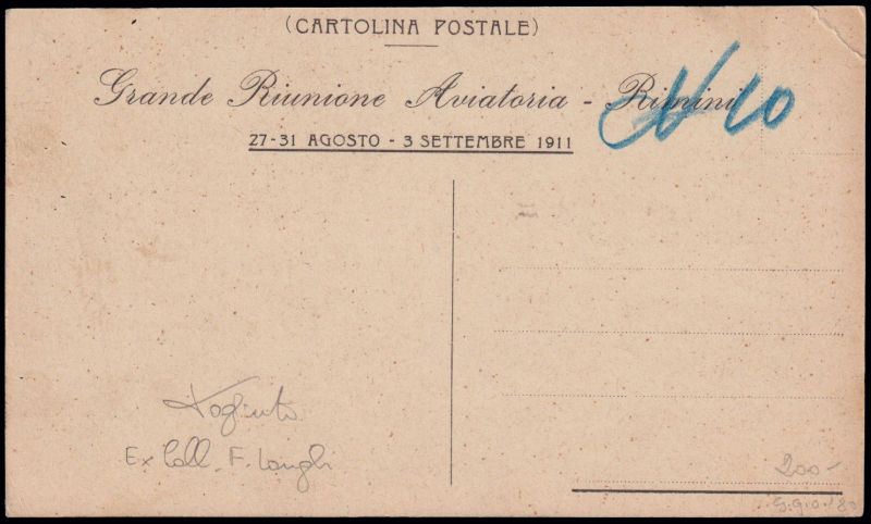 1911 RIMINI RIUNIONE AVIATORIA. Cartolina ufficiale policroma verticale firmata Codognato. Nuova. Al retro a stampa "Grande Riunione Aviatoria - Rimini / 27 - 31 Agosto - 3 Settembre 1911. Longhi 521. Piega d'angolo.