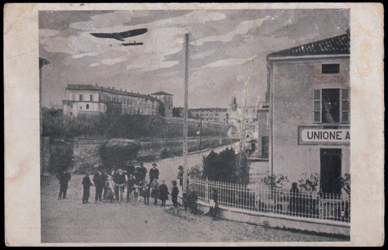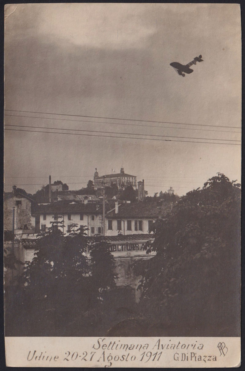 1911 UDINE / RIUNIONE AVIATORIA. Cartolina fotografica verticale (TENSI) con panorama della città e monoplano in volo, al recto "Settimana aviatoria / Udine 20-27 agosto 1911. G. di Piazza", viaggiata. Longhi 519a