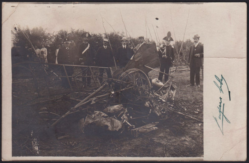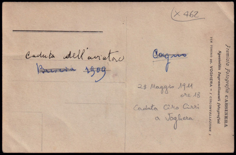 1911 VOGHERA / PRIMI VOLI E MORTE DI CIRO CIRRI. Cartolina fotografica del velivolo distrutto (Premiata Fotografia CASSINERA). Nuova. Longhi 464b (nuova numerazione). Riprodotta a pag. 123 del catalogo "Aerofilia