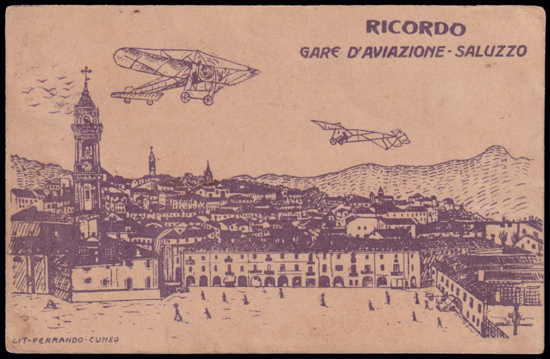 1912 SALUZZO / GARE DI AVIAZIONE. Cartolina "Ricordo / Gare d'Aviazione - Saluzzo" , (LIT. FERRANDO - CUNEO). Nuova. Longhi 579. Riprodotta a pag. 89 del catalogo "Aerofilia Italiana". (Image) (ImageA)