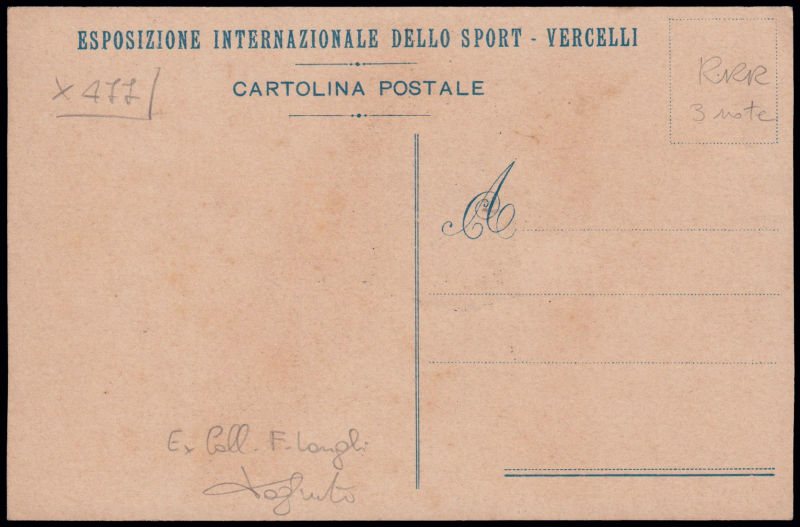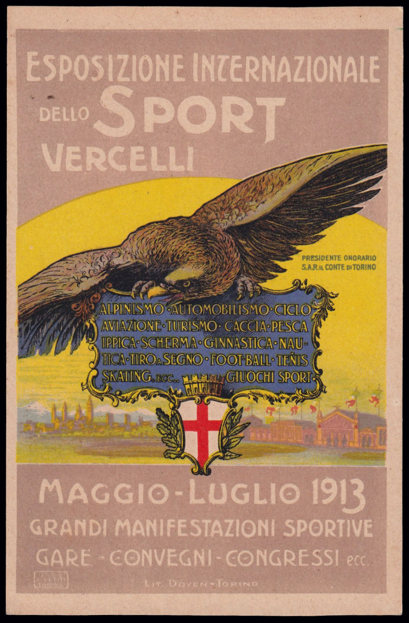 1913 VERCELLI / ESPOSIZIONE INTERNAZIONALE DELLO SPORT. Cartolina verticale ufficiale policroma Studio G. Petiti (Lit. Doyen, Torino). Nuova. Longhi 662. Riprodotta a pag. 200 del catalogo "Aerofilia Italiana" nuova
