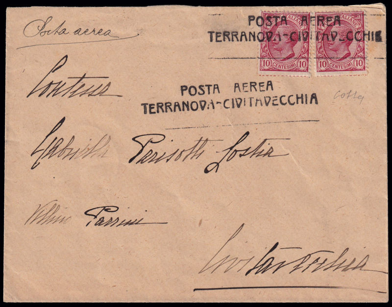 1917 COLLEGAMENTO AEREO SARDEGNA - CONTINENTE - SARDEGNA. Aerogramma affrancato con due francobolli Leoni da 10 centesimi annullati col bollo speciale "Posta Aerea/ Terranova - Civitaveccia". Al retro timbro di partenza