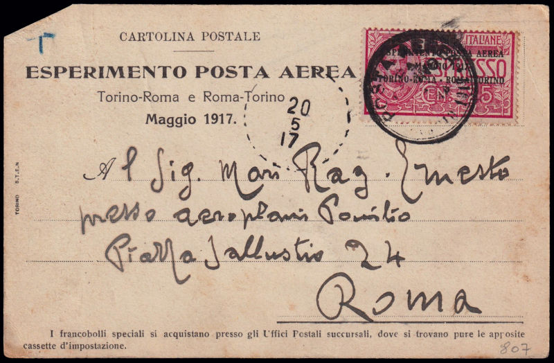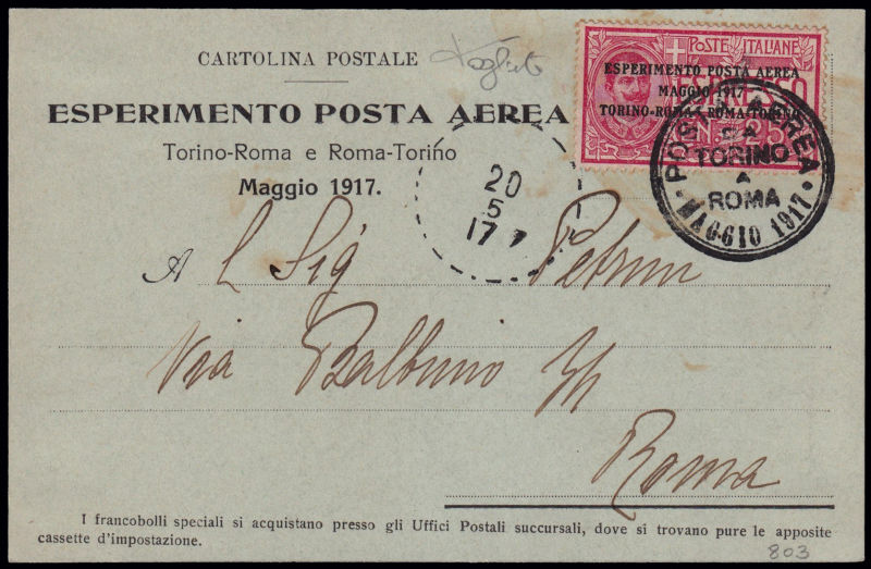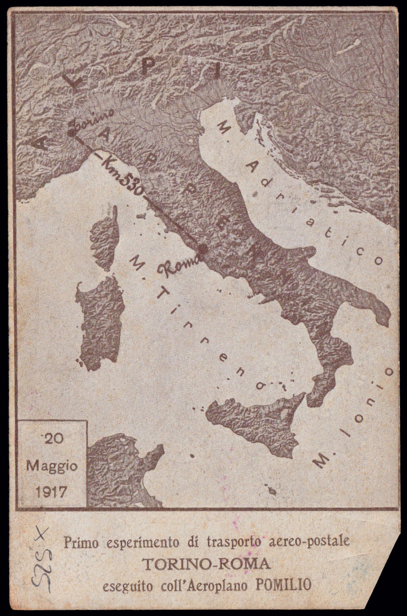 1917 ESPERIMENTI DI POSTA AEREA TORINO - ROMA - TORINO. Cartolina postale Pomilio con i normali annulli del volo Torino - Roma e cartina grigia. Longhi 807. (Image) (ImageA)