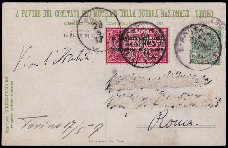 1917 ESPERIMENTO DI POSTA AEREA - VOLO POSTALE TORINO - ROMA. Rara cartolina a favore del Comitato Pro Mutilati della Guerra Nazionale - Torino da c.20 spedita con francobollo speciale e complemento di affrancatura con
