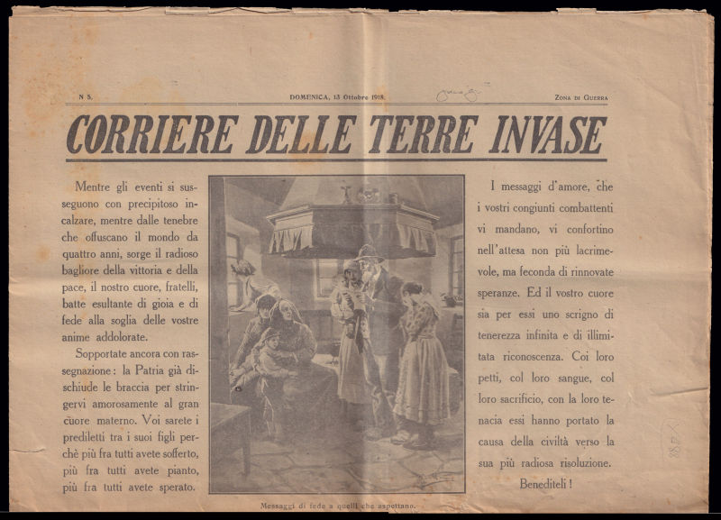 1918 CORRIERE DELLE TERRE INVASE. Domenica 2 Giugno 1918. N° 2 - Fascicolo di 4 pagine formato (510x350mm). Longhi 945. Riprodotto a pag. 147 del catalogo "Aerofilia Italiana". Firma di garanzia F. Longhi. Raro. (Image)