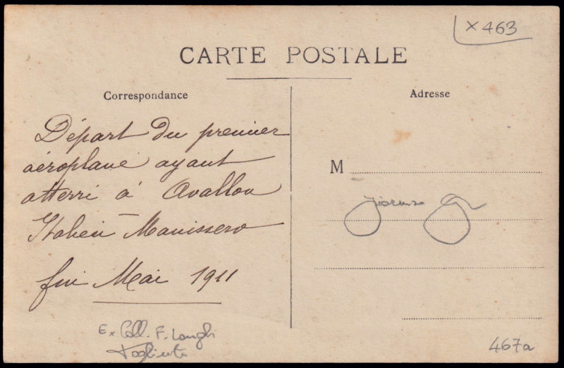 1911 RAID PARIGI - ROMA - TORINO. Cartolina fotografica orizzontale del Bleriot di Manissero che riparte da Avallon, in Borgogna. Al verso manoscritto "Depart du premier aeroplane ayant atterri a Avallon. Italien