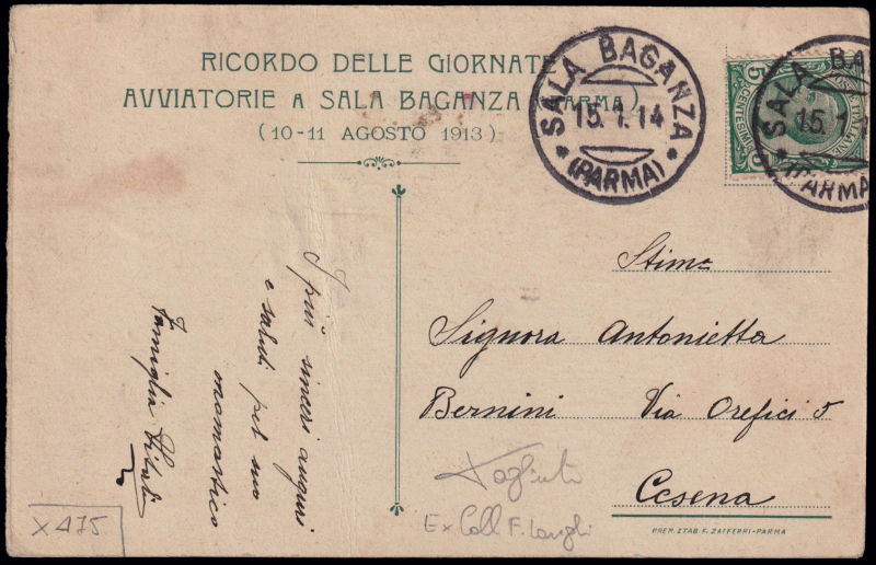 1913 SALA BAGANZA (PARMA) / GIORNATE AVIATORIE. Cartolina orizzontale "Ricordo delle Giornate AVVIATORIE A sala Baganza (Parma) (10 - 11 Agosto 1913)" spedita da Sala Baganza per Cesena. Longhi 697. Rarissima nota in