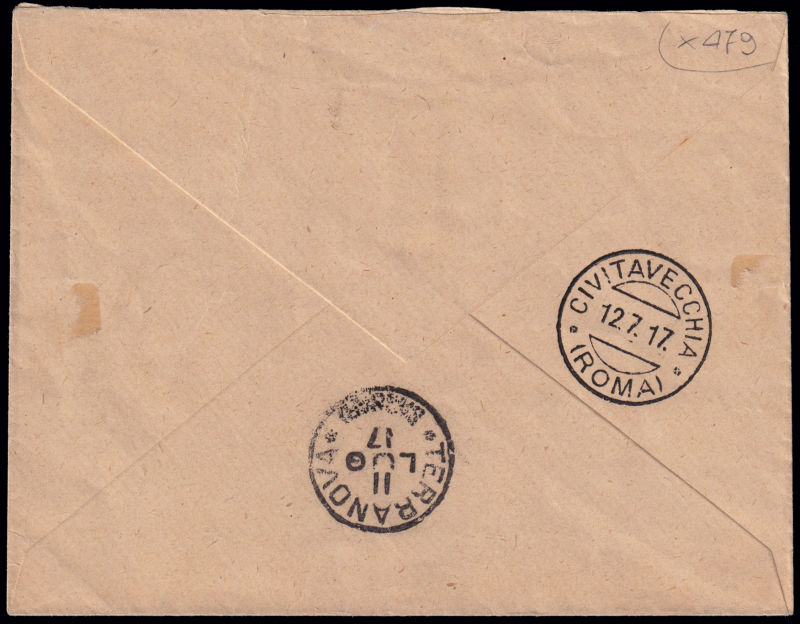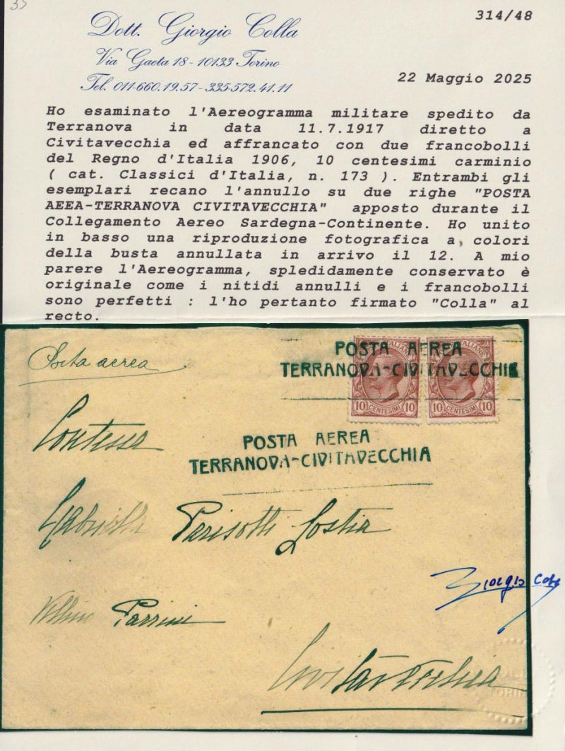 "Terranova 11 LUG 17" e di arrivo "Civitavecchia ° (ROMA) ° 12.7.17". Dettagliato certificato Colla (2025). (Image) (ImageA)