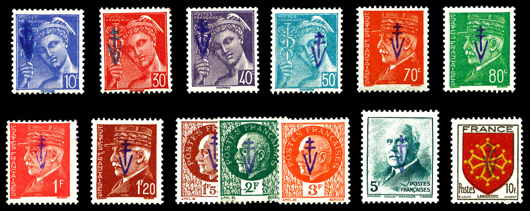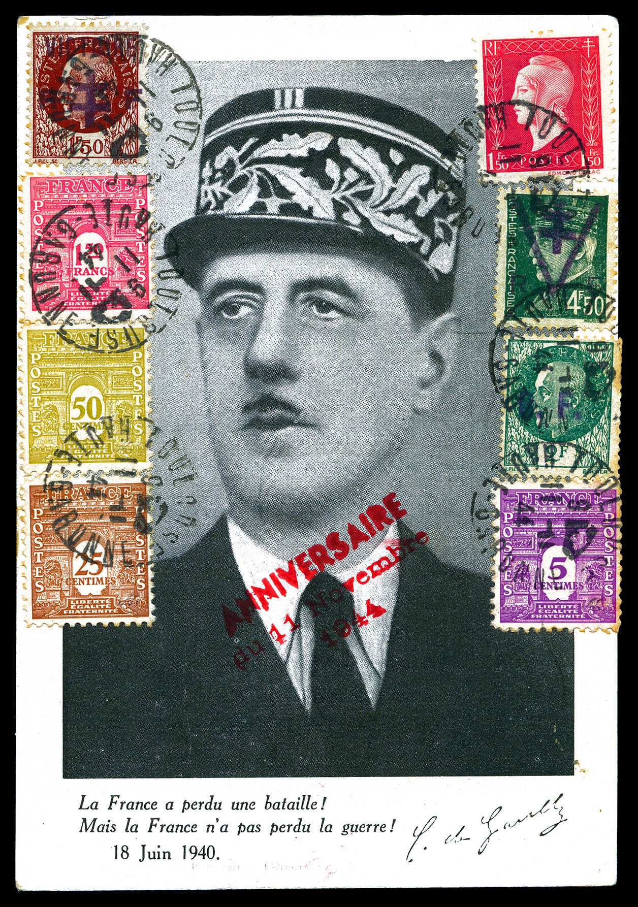 TOULOUSE: Carte à l'effigie du Général D Gaulle avec 8 timbres dont 1f50 brun. Victoire, RF et croix de Lorraine-4fr50 vert surch RF