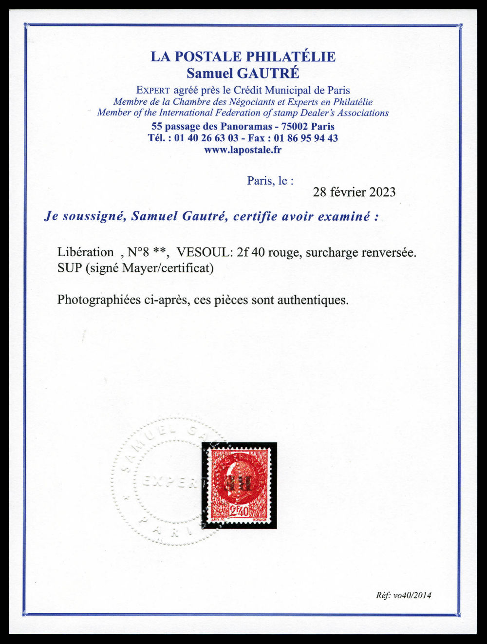 N°8, VESOUL: 2f 40 rouge, surcharge renversée. SUP (signé Mayer/certificat) Qualité: ** Cote: 630 euros (Image) (imagea)