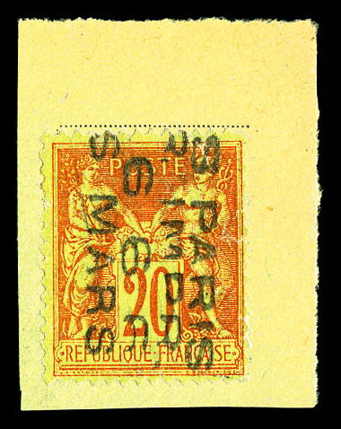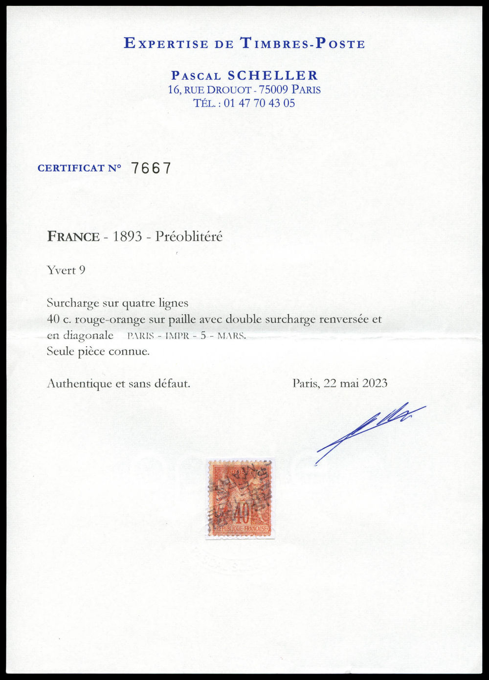 2077 ng imageN°9, 40c rouge-orange sur paille surchargé 4 lignes DOUBLE SURCHARGE renversée du 5 MARS, SEULE PIECE CONNUE. SUPERBE. R.R.R. (certificats) Qualité: (*) (Image) (imageb) (All Images)