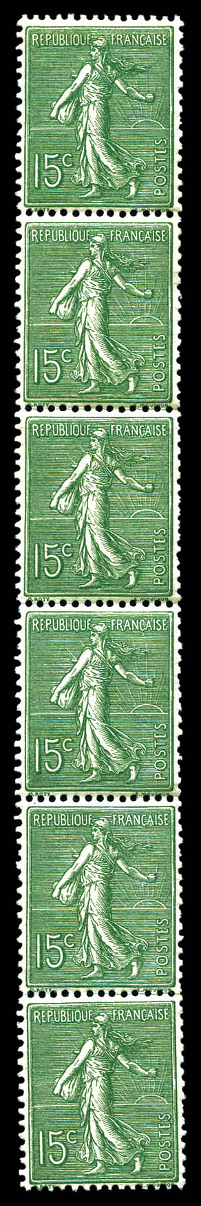 2121 nh imageN°3, 15c Semeuse lignée vert-gris, bande de 6 exemplaires. SUP. R.R. (certificat) Qualité: ** Cote: 1650 euros (Image)