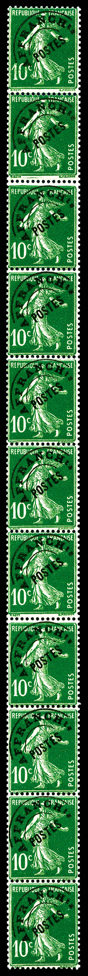 2127 nh imageN°44, Préo, 10c Semeuse vert, bande verticale de 11 exemplaires. SUP (certificat) Qualité: ** Cote: 600 euros (Image)