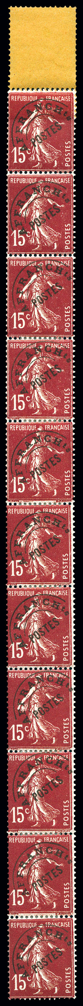 2128 og imageN°45, Préoblitéré: 15c Semeuse brun-lilas, bande verticale de 11 exemplaires avec amorce. SUP. R.R.R. (certificat) Qualité: * Cote: 5300 euros (Image)