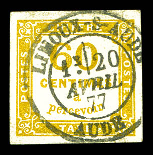 2140 imageN°8, 60c jaune-bistre obl càd de LIMOUX SUR AUDE du 20 avril 1877, infime pelurage. TB (signé Scheller/Calves/certificat) Qualité: Oblitéré Cote: 1600 euros (Image) (imagea) (All Images)