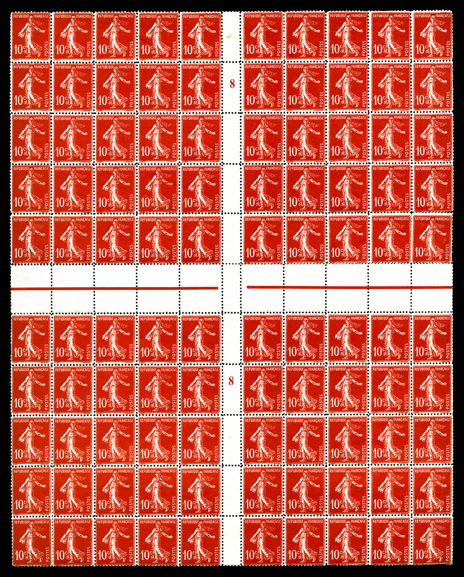 N°138, 10c Semeuse, faux de Turin en panneau de 100 exemplaires millésimes '8'. TB. R. (certificat) Qualité: ** Cote: 2000 euros (Image)