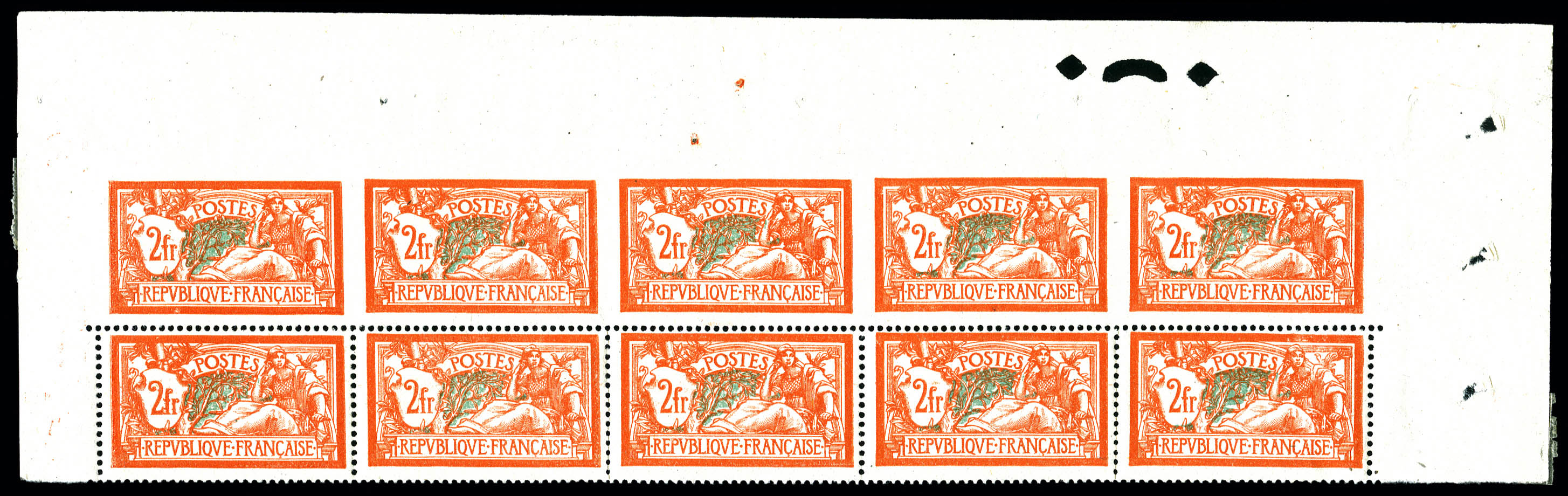 N°145g, 2f Merson, exceptionnelle variété: cinq exemplaires non dentelés tenant à dentelés en bloc de dix haut de feuille avec
