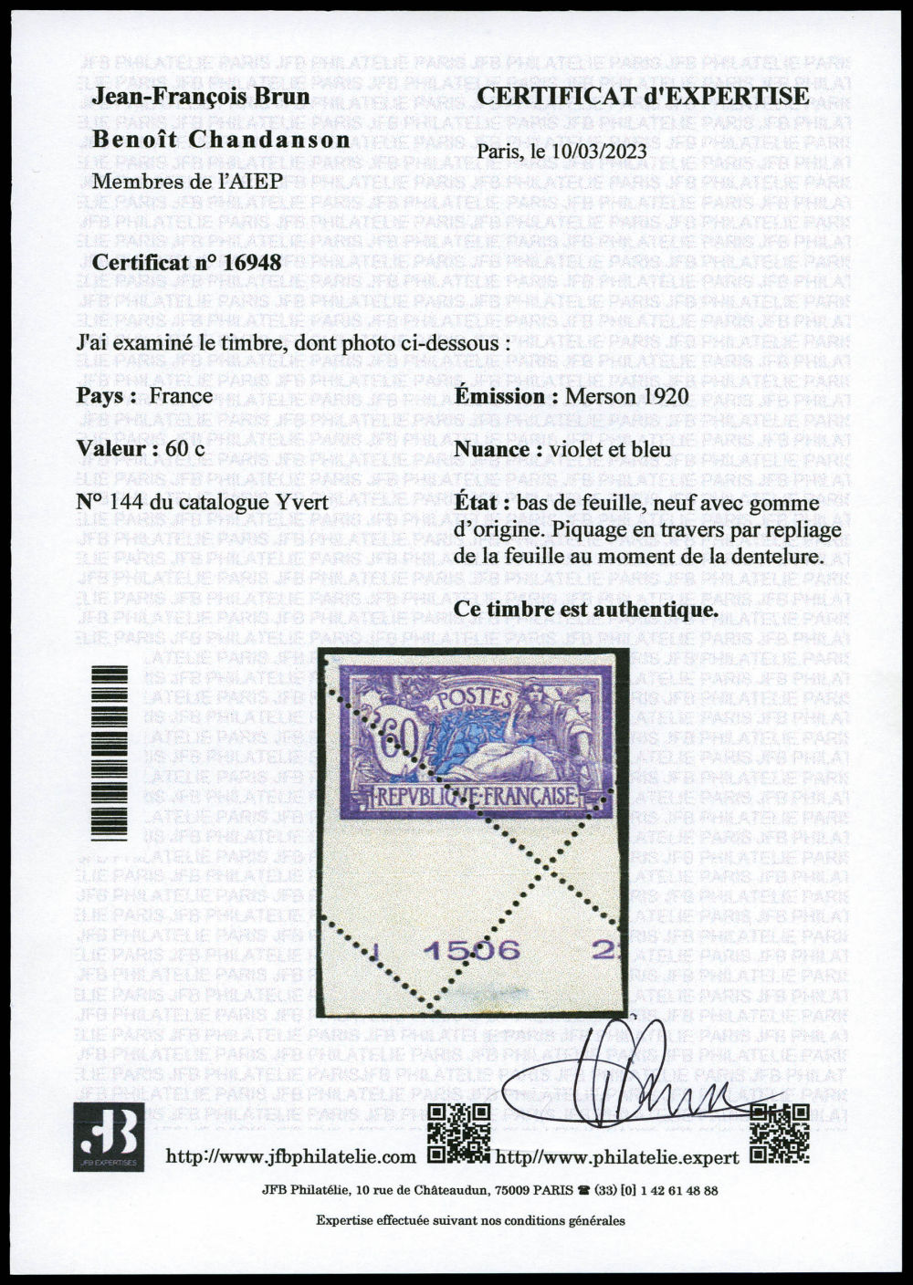 N°144, 60c Merson: Spectaculaire piquage en diagonale par pliage de la feuille au moment de la dentelure. SUP. R. (certificats)