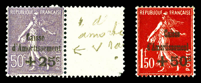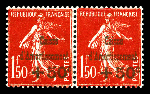 N°277a, +50c sur 1f 50 rouge: C de Caisse au dessus du premier t d'Amortissement TAN, la paire quasi **. TB Qualité: * Cote: 400