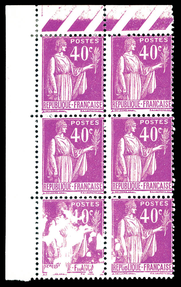 N°281, 40c Paix: spectaculaire impression partielle sur bloc de quatre. SUP (certificat) Qualité: * (Image)