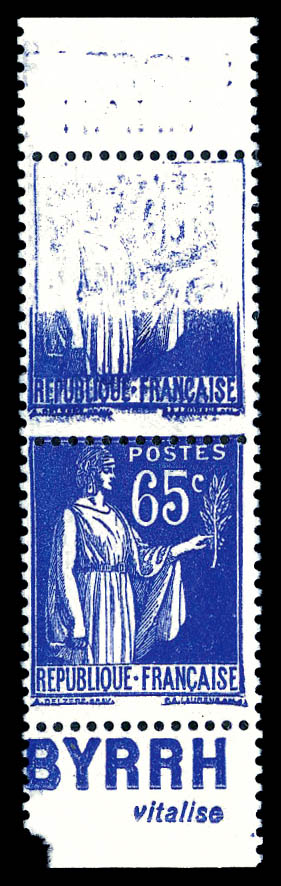 N°365, 65c Paix, impression partielle tenant à normal en paire avec pub. SUP (certificat) Qualité: ** (Image)