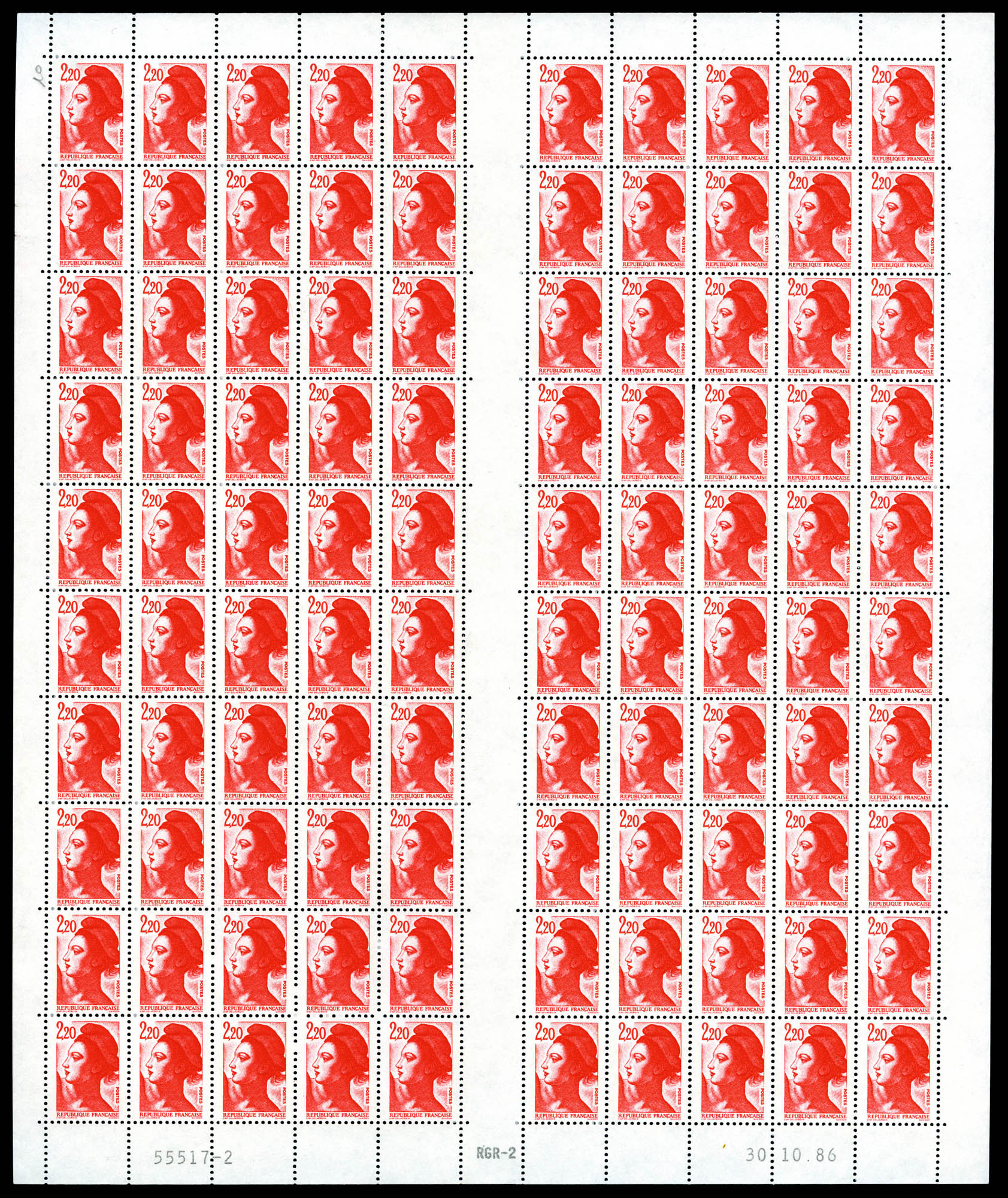 N°2376, 2,20f Liberté, 1er Tirage RGR-2 en feuille complète de 100 exemplaires datée du 30.10.86. TTB (certificat) Qualité: ** (Image)