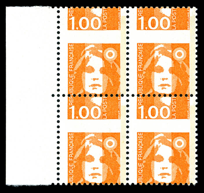 N°2620, 1F orange: piquage à cheval sur bloc de quatre bord de feuille, SUP (certificat) Qualité: ** (Image)