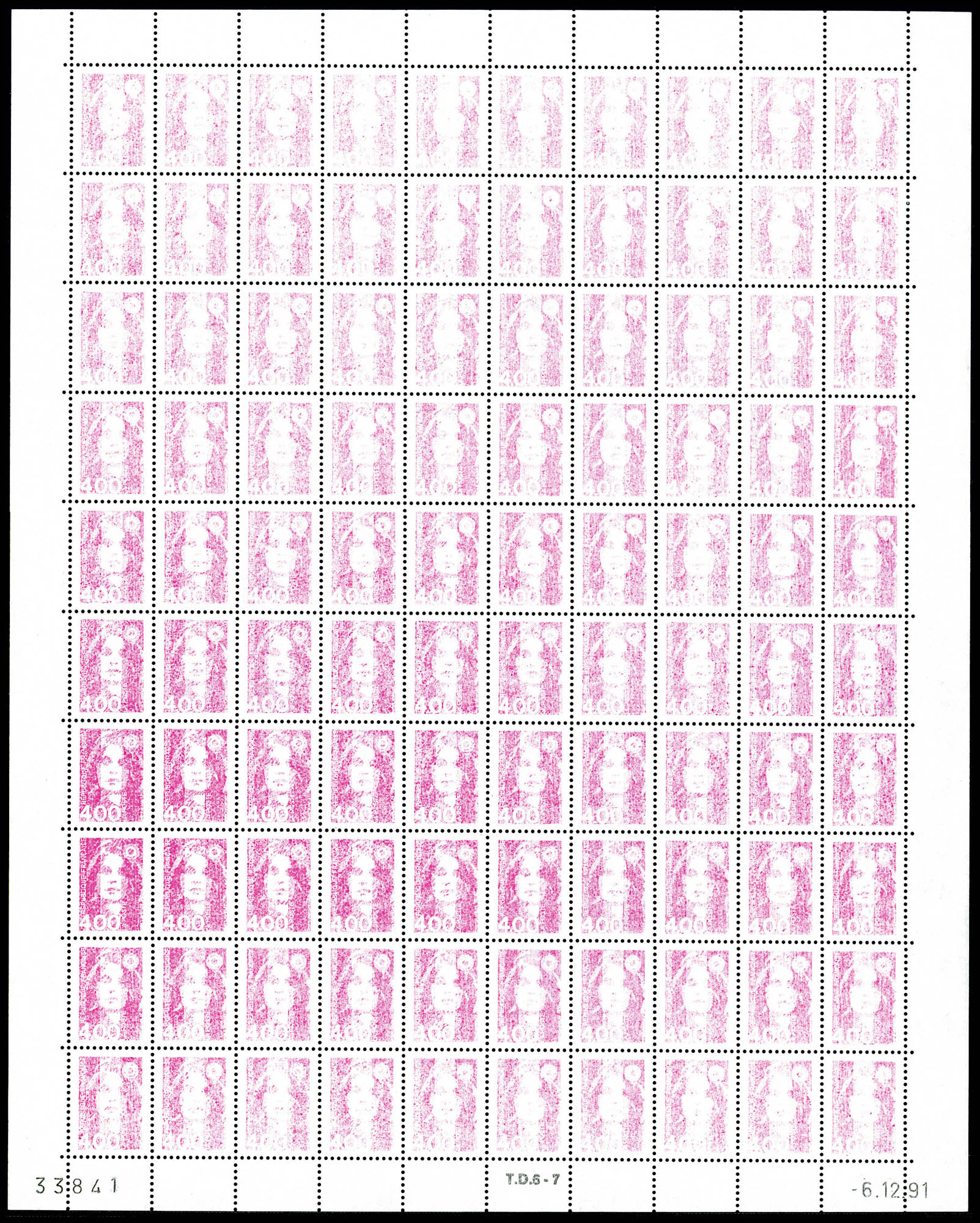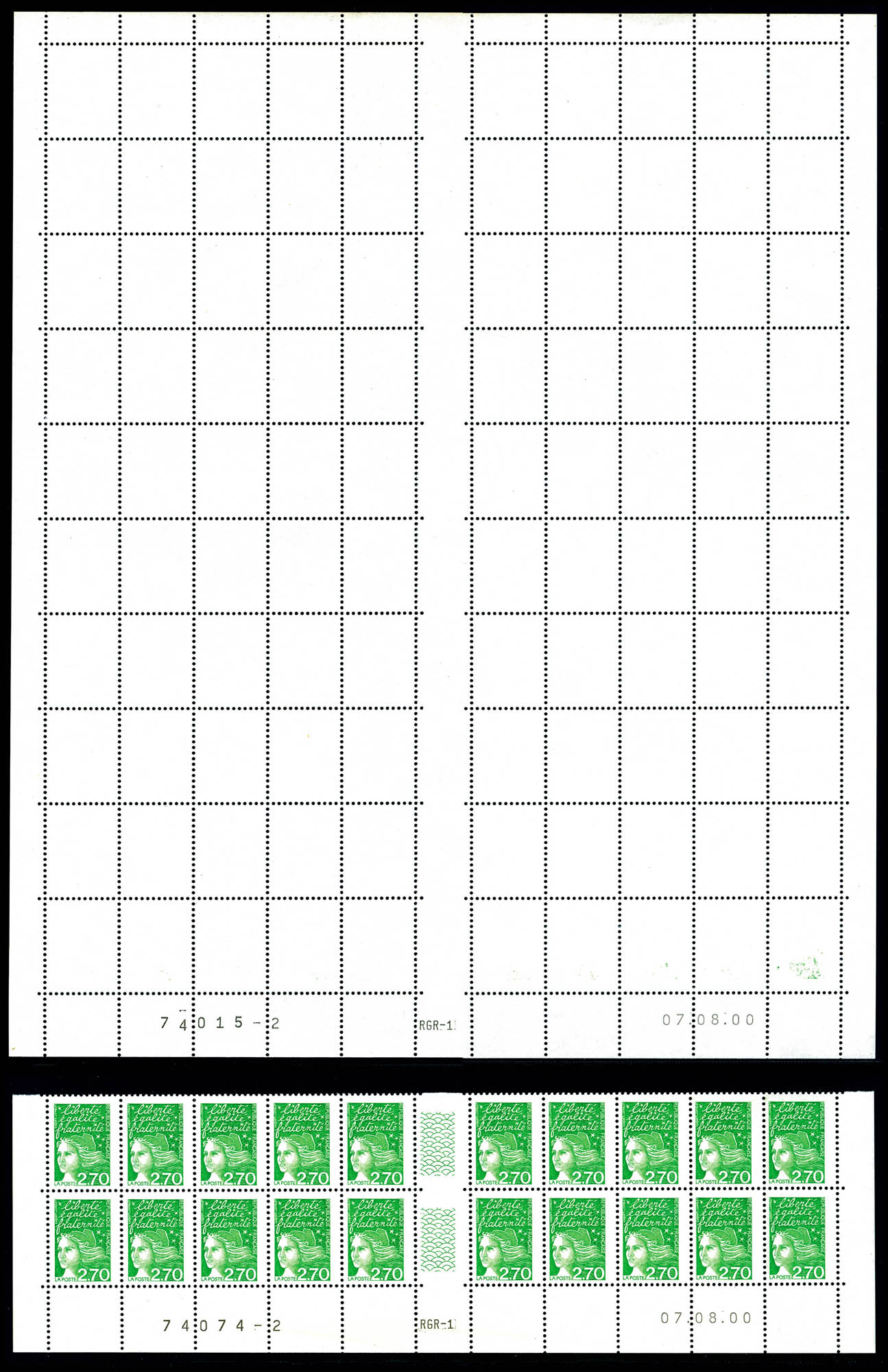 N°3091h, 2,70 Luquet, vert absent, TIMBRE NON IMPRIME en feuille complète de 100 exemplaires avec numéro et date, probablement unique