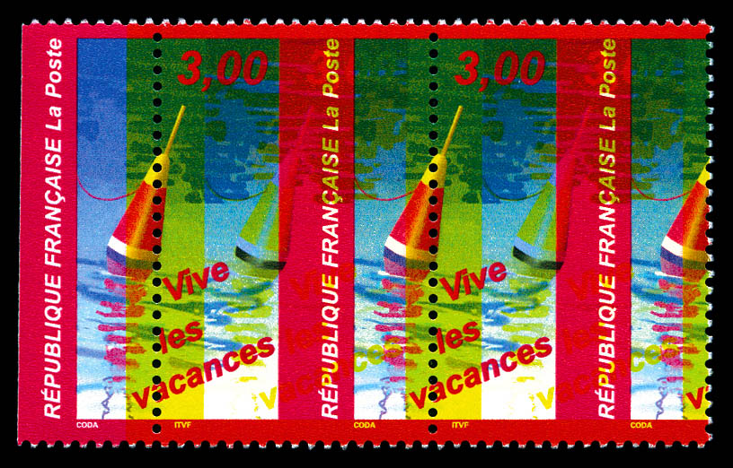 N°3243b, 3f 'Vive les vacances', couleur jaune très décalée et piquage à cheval en paire bdf. SUP (certificat) Qualité: ** Cote: