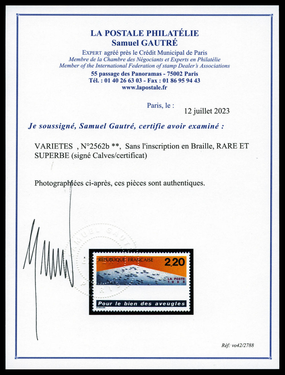 N°2562b, Sans l'inscription en Braille, RARE ET SUPERBE (signé Calves/certificat) Qualité: ** Cote: 3500 euros (Image) (imagea)