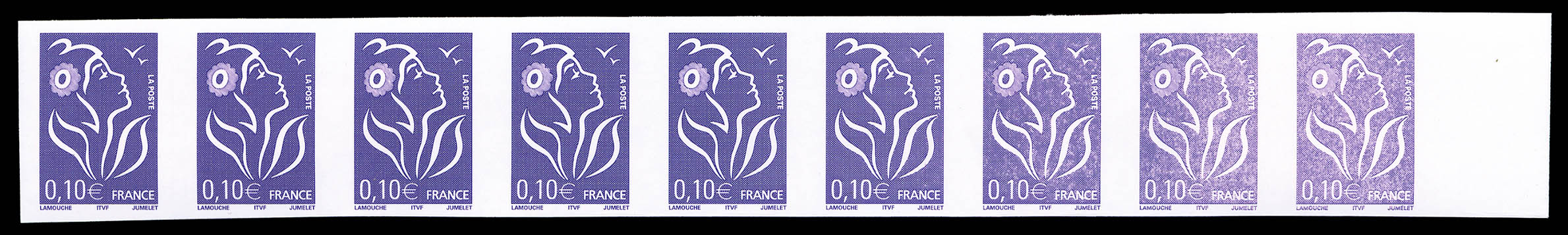 N°3732b, Lamouche, 0,10€ violet rouge (légende I.T.V.F), NON DENTELE ACCIDENTEL AVEC DEGRADE DE COULEUR en bande de 9 exemplaires,