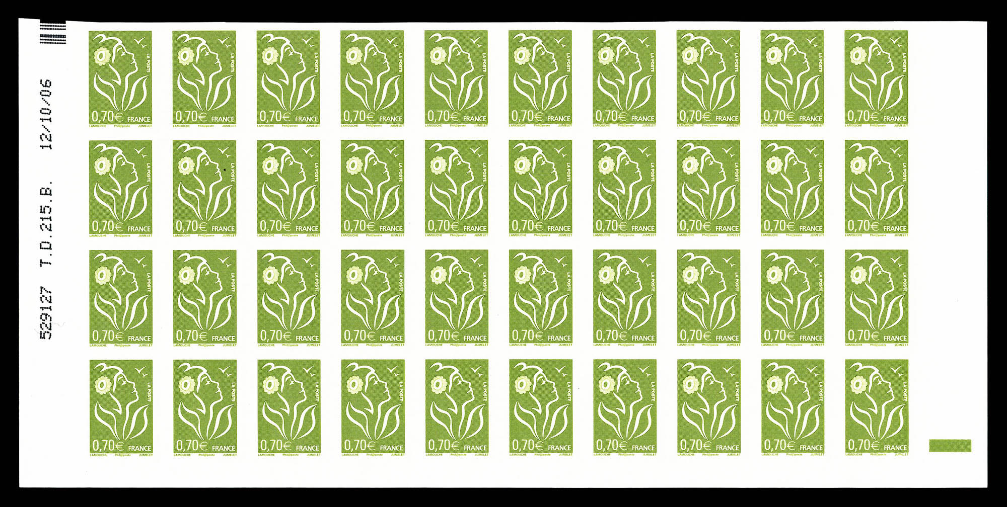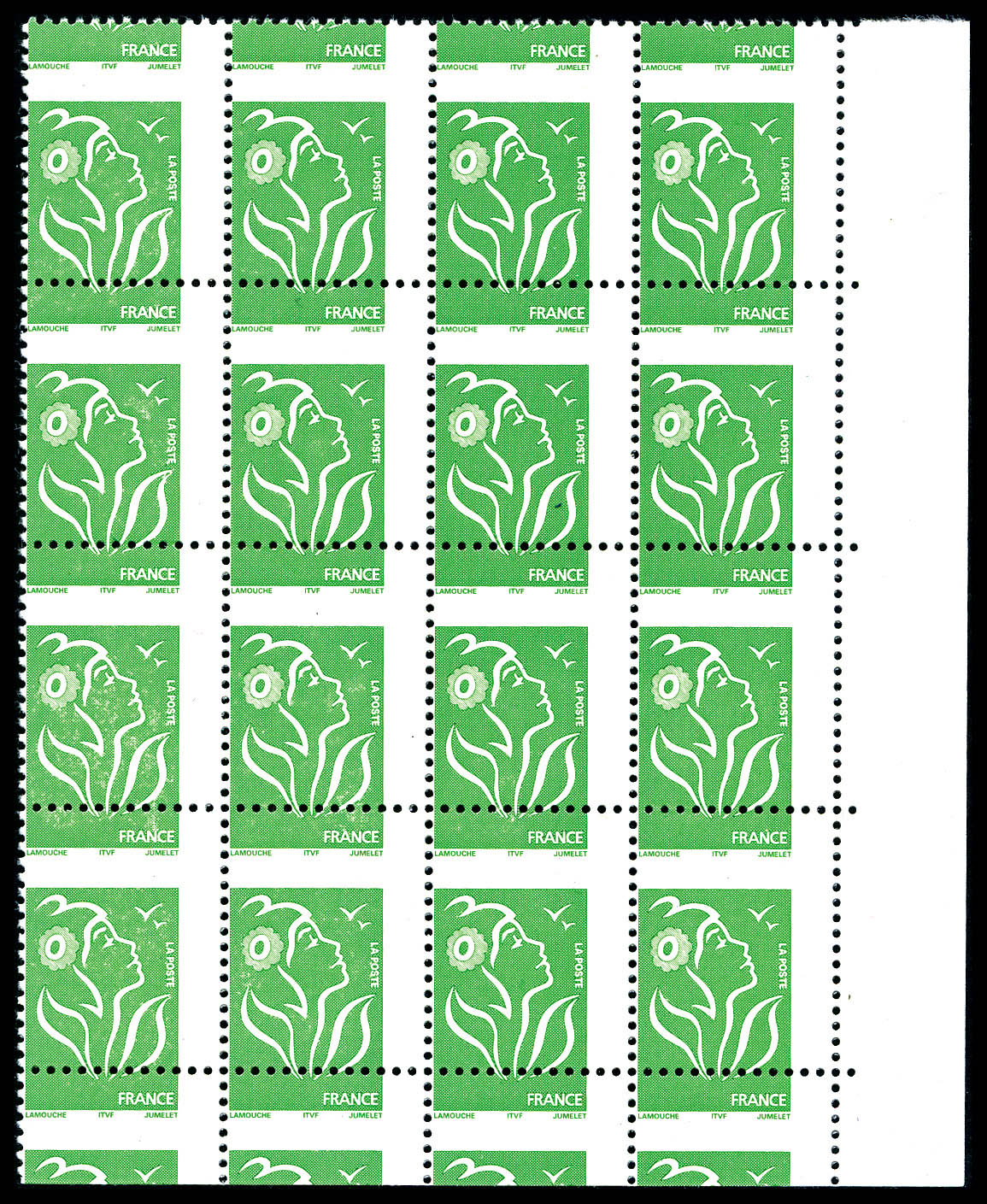 N°3733, Lamouche TVP vert: piquage à cheval sur panneau de 20 exemplaires bord de feuille. SUP (certificat) Qualité: ** Cote: 1700