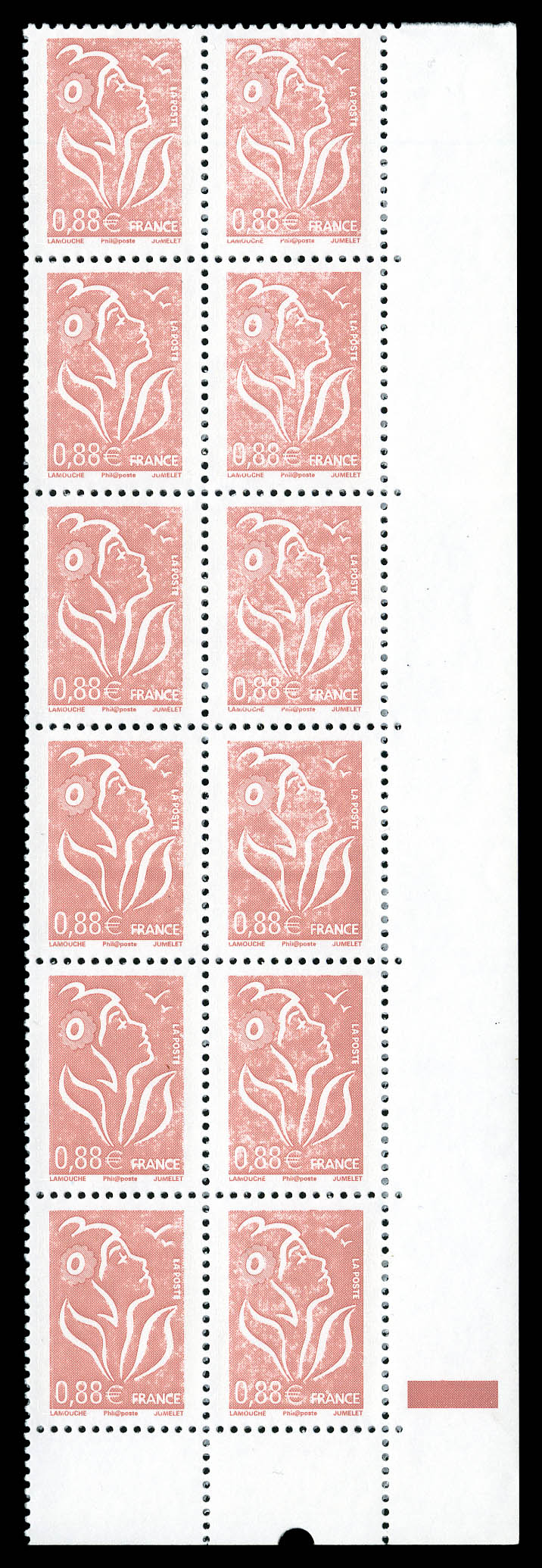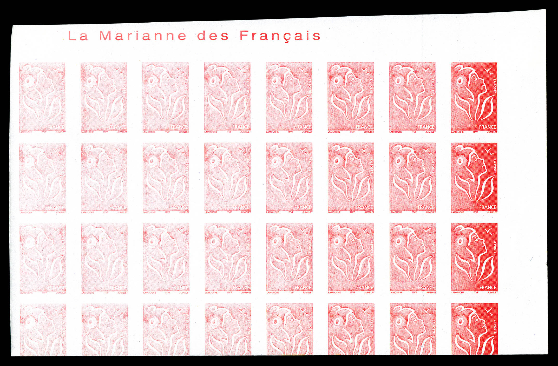 N°3734, Lamouche TVP rouge: impression défectueuse sur bloc de 24 non dentelé, coin de feuille avec mention 'La Marianne des