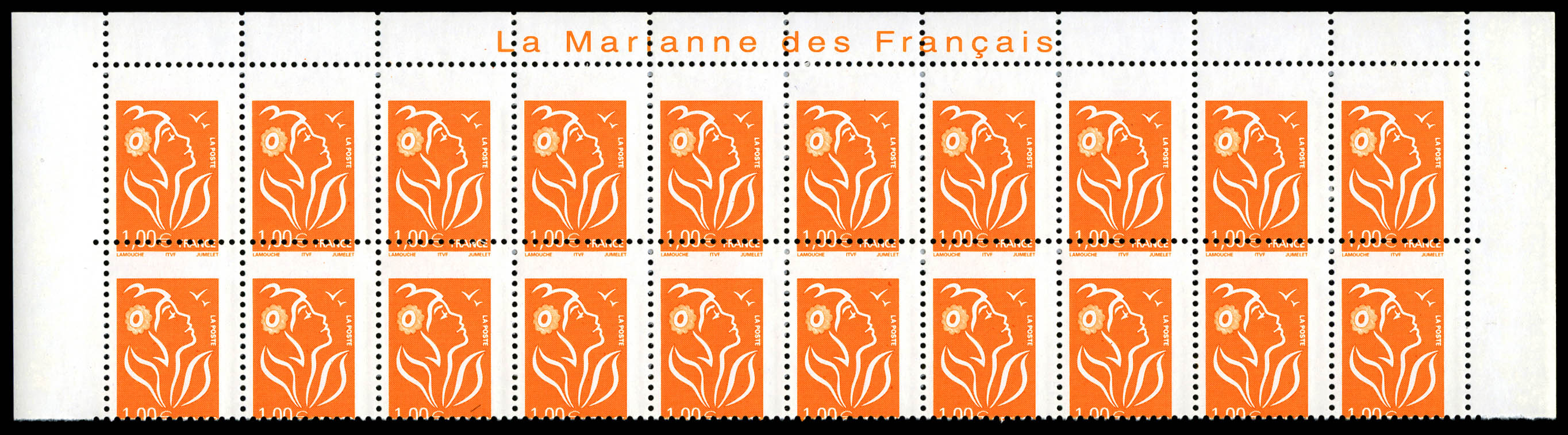 N°3739e, 1€ Lamouche, piquage à cheval sur panneau de 20 exemplaires haut de feuille avec inscriptions (ex collection J.P Comtet).
