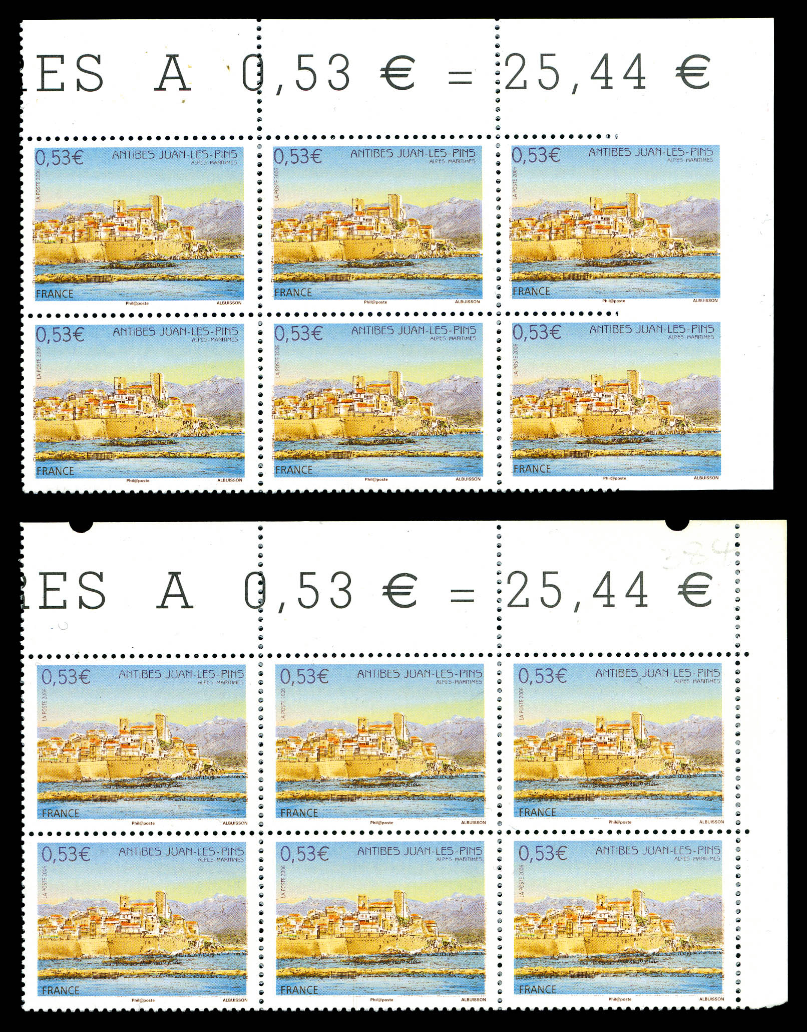N°3940, Antibes, piquage partiel à 50% sur 2 exemplaires tenant à normaux en bloc de 6 cdf. SUP. R. (certificat) Qualité: ** (Image)