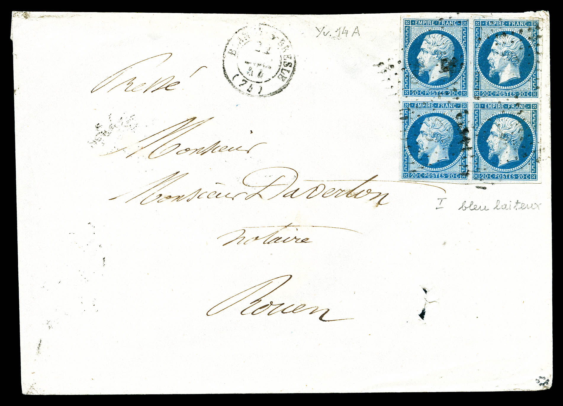 N°14Af, 20c bleu laiteux type I en bloc de quatre sur lettre de BLANGY SUR BRESLE pour ROUEN. TB (signée/certificat) Qualité: Oblitéré (Image)