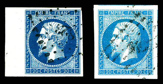 N°14, 20c bleu type I, bord de feuille + ex bleu pâle grandes marges avec voisins. TTB Qualité: Oblitéré