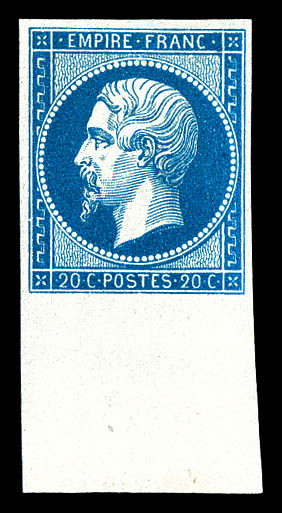N°14Ai, 20c bleu laiteux bord de feuille inférieur avec liseret d'encadrement (2ex*), fraîcheur postale, R.R.R, SUP (certificat) Qualité: ** (Image)